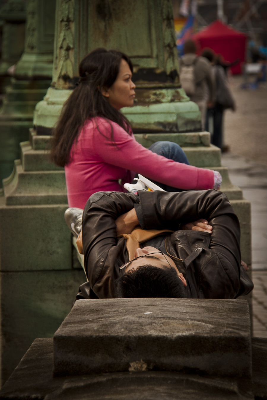 Non loin, deux jeunes filles, membres d’une autre fanfare attendent aussi, assises sur le pavé mouillé.