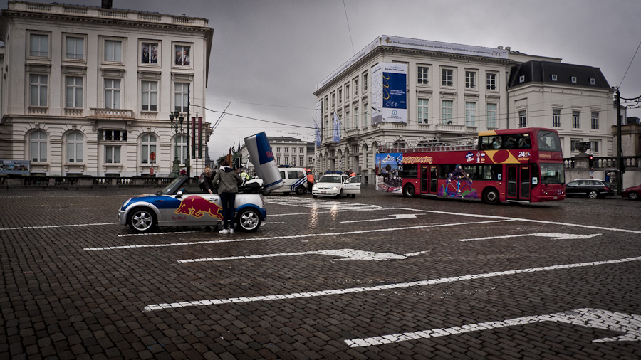 Toujours sur la Place des Palais, d’autres jeunes filles distribuent des échantillons d’une boisson énergétique qui donne des ailes, mais n’arrête pas la pluie.