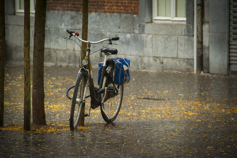 Vélo sous la pluie (Place Saint-Etienne, Liège) – photo : Gilderic