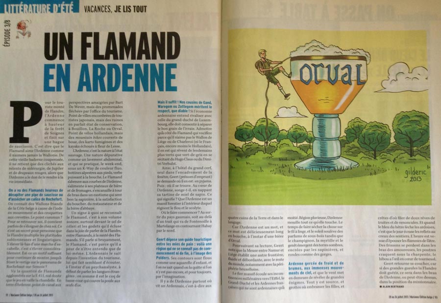 Le 3e épisode des chroniques estivales d’Alain Bertrand, que j’illustre tout l’été, est paru ce samedi, dans l’édition belge de Marianne. Ce n’est pas le dessin initialement prévu qui est paru cette semaine, puisque, à la suite d’une inversion, le dessin pour « Un flamand en Ardenne » a été publié avec la chronique précédente (« Pique-nique sur l’autoroute« ).