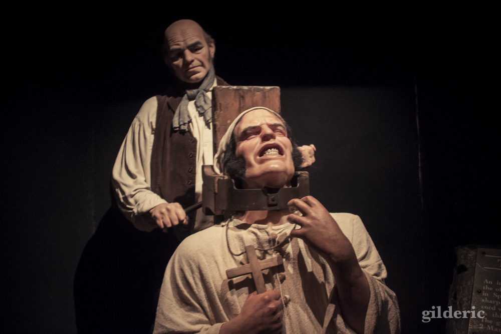 Une pièce « Behind the scenes » est plus intéressante. On y découvre l’étonnante histoire de Madame Tussaud, née Marie Grosholtz, qui a commencé sa carrière en France en réalisant la statue de cire de Voltaire. Après avoir enseigné les arts à la soeur de Louis XVI et vécu à Versailles, elle sera employée par les révolutionnaires pour réaliser des masques mortuaires de victimes de la guillotine (dont Marie Antoinette, Marat et Robespierre).