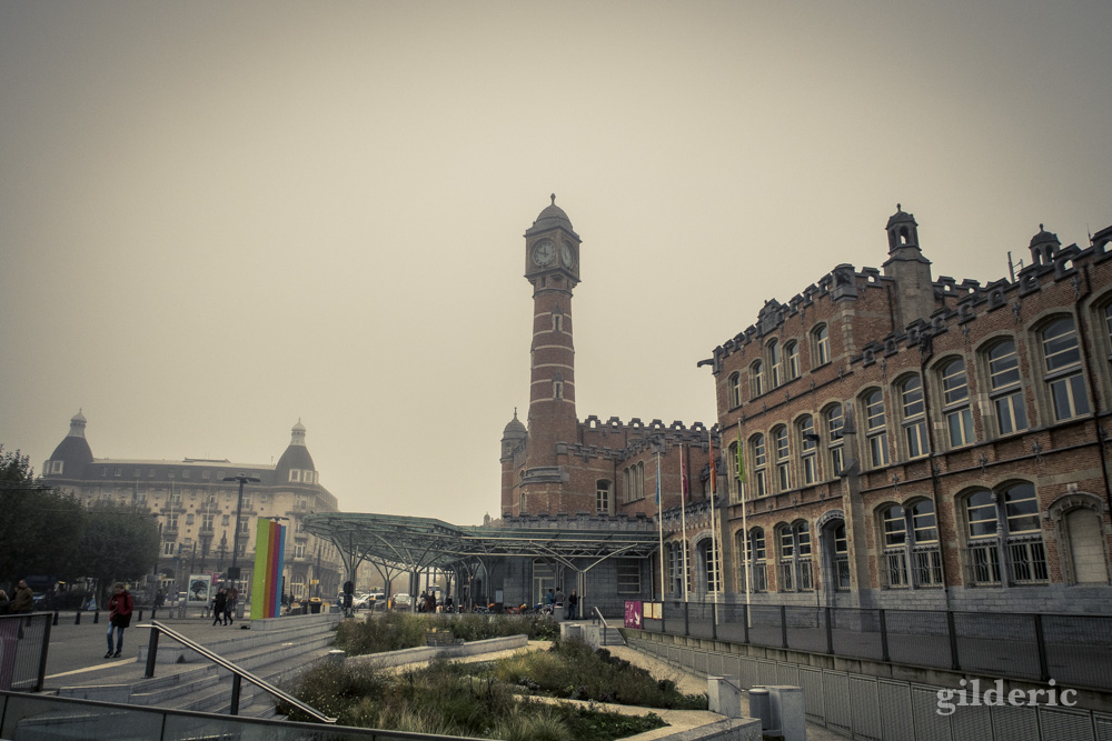 La gare de Gand aussi est plongée dans la brume. Elle est toujours en pleine transformation. On arrive dans une partie flambant neuve et après avoir traversé un tunnel, on ressort à côté de l’ancienne entrée, qui à sa façon ne manque pas de charme.