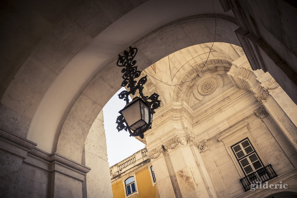 Arcade et lampe finement ouvragée à Lisbonne.
