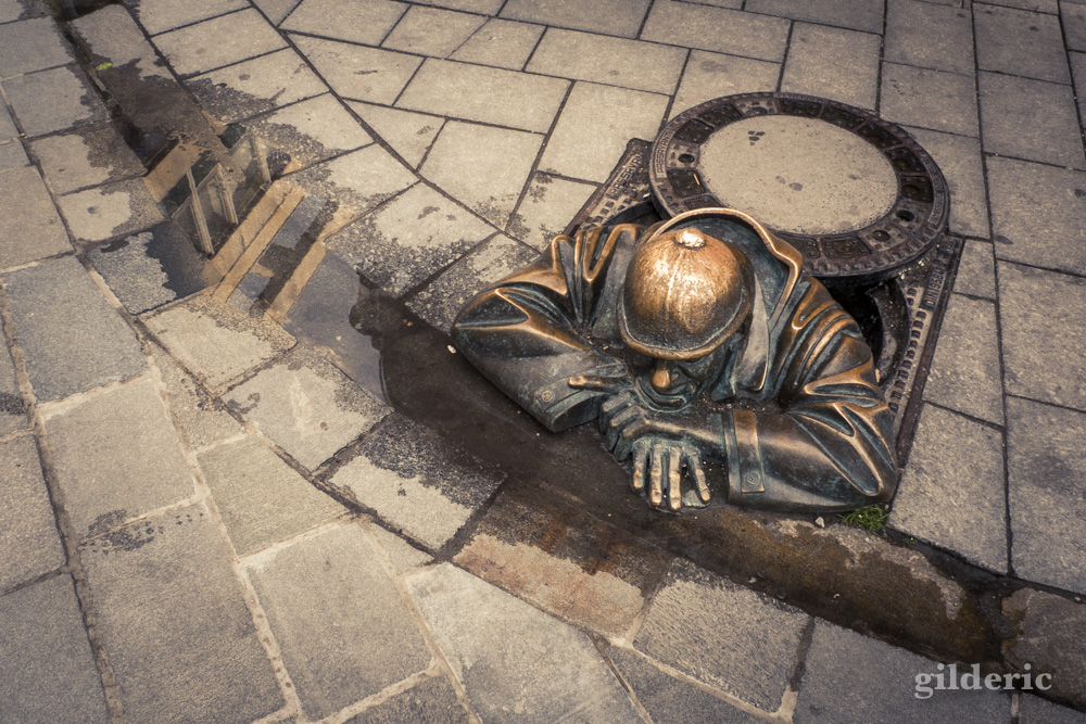 A Bratislava, une célèbre statue semble sortir d’une plaque d’égoût.