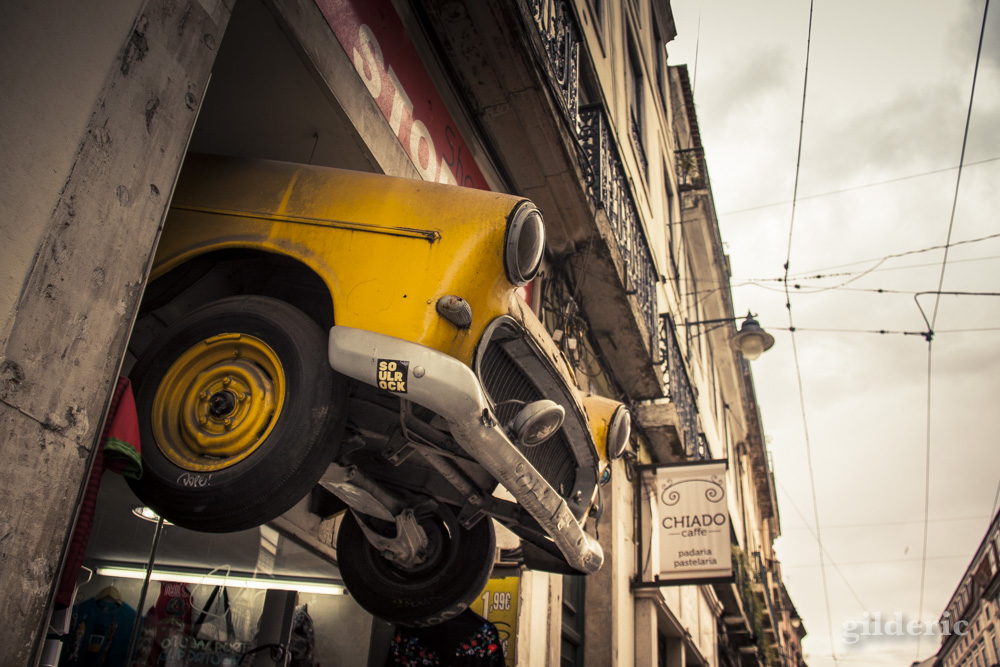 Une voiture dans un façade d’un magasin de Lisbonne