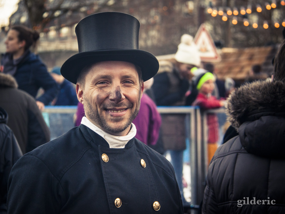 Sur le marché de Noël, selon la tradition, des ramoneurs barbouillent le nez des visiteurs d’un peu de suie.