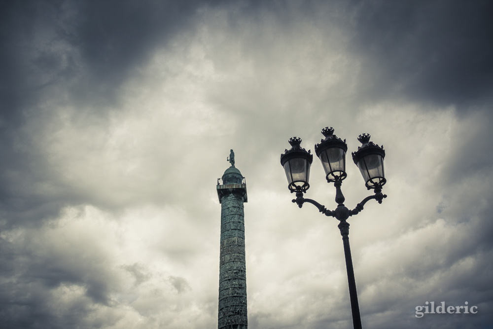 Un réverbère et la Colonne Vendôme, deux détails parisiens mis en valeur par un ciel dramatique.