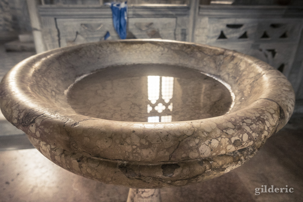 J’ai remarqué aussi ce bénitier inhabituel, où se reflète sereinement l’architecture du temple.