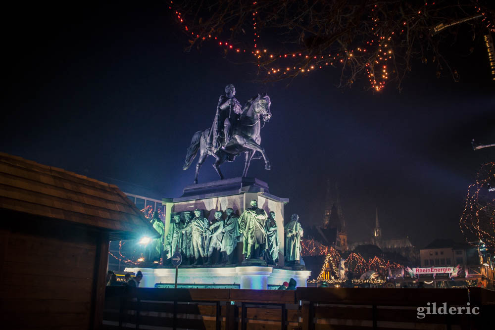 A Cologne, la statue équestre du roi Wilhelm Heinrich III domine le marché de Noël de la Heumarkt.