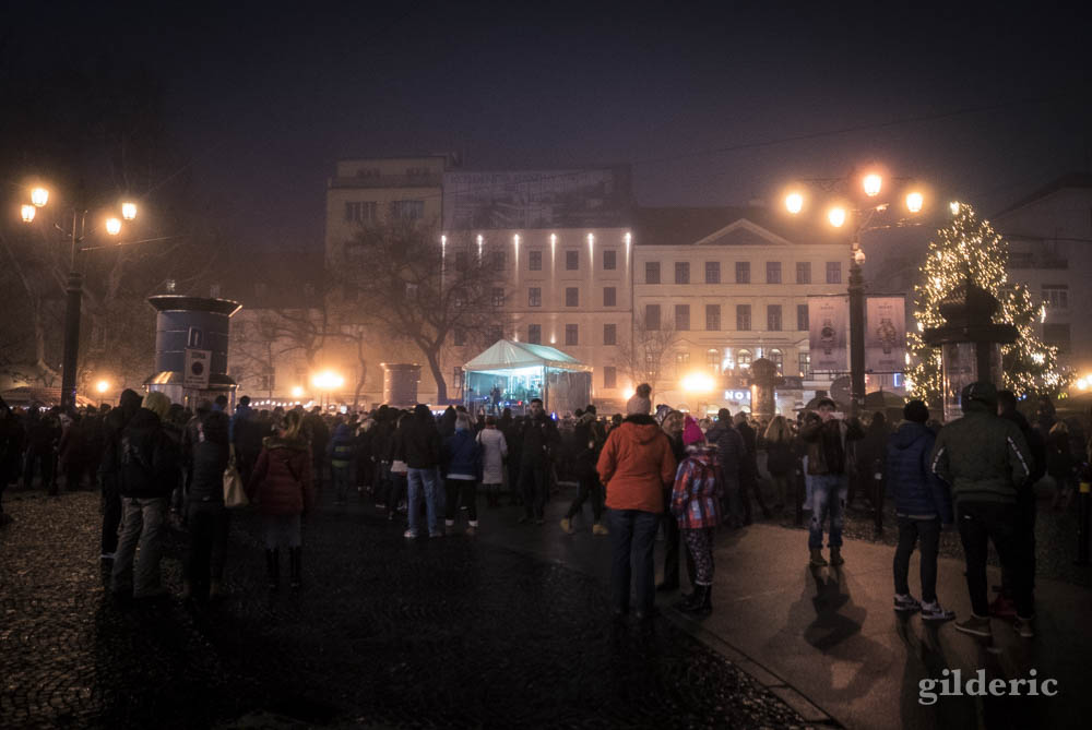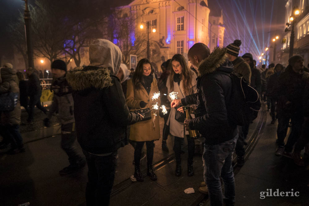 Après un dîner typiquement slovaque dans l’intimité de l’appartement de nos amis, vers 23 heures, nous avons pris le tram pour assister aux célébrations du Nouvel An au coeur de la vieille ville.