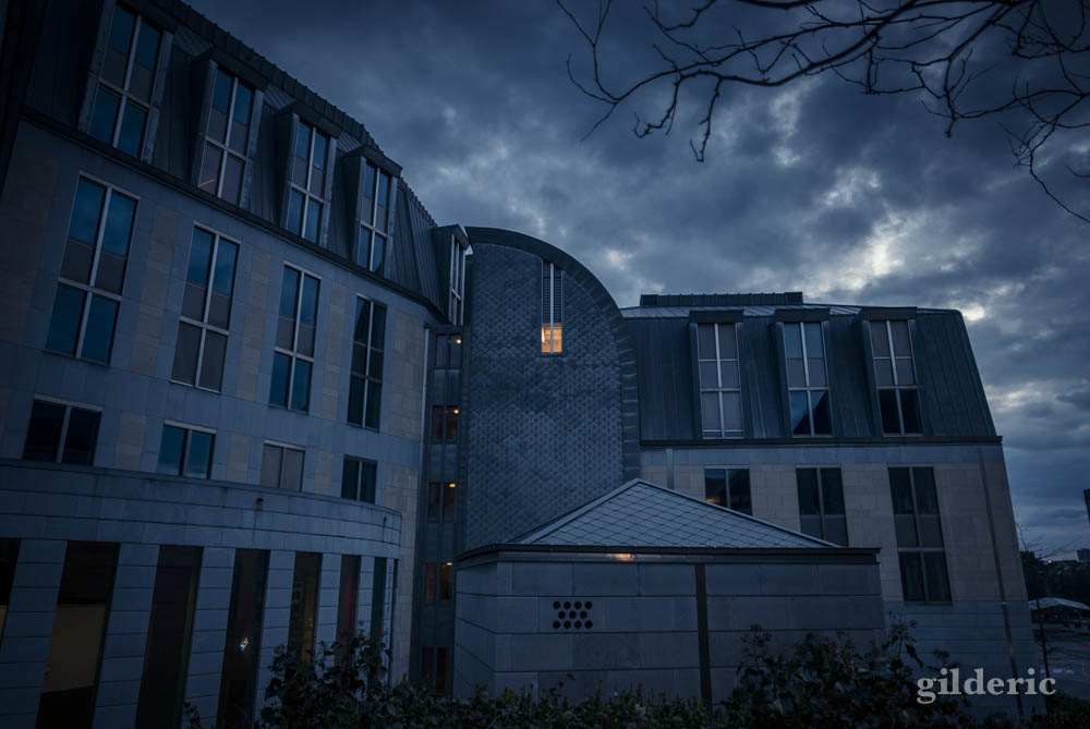 Les annexes du Palais de justice prennent un air sinistre sous le ciel lourd et la menace de pluie. Quelqu’un travaille déjà (ou a oublié d’éteindre la lumière la veille). L’ambiance colle parfaitement à l’architecture et à la fonction du bâtiment.