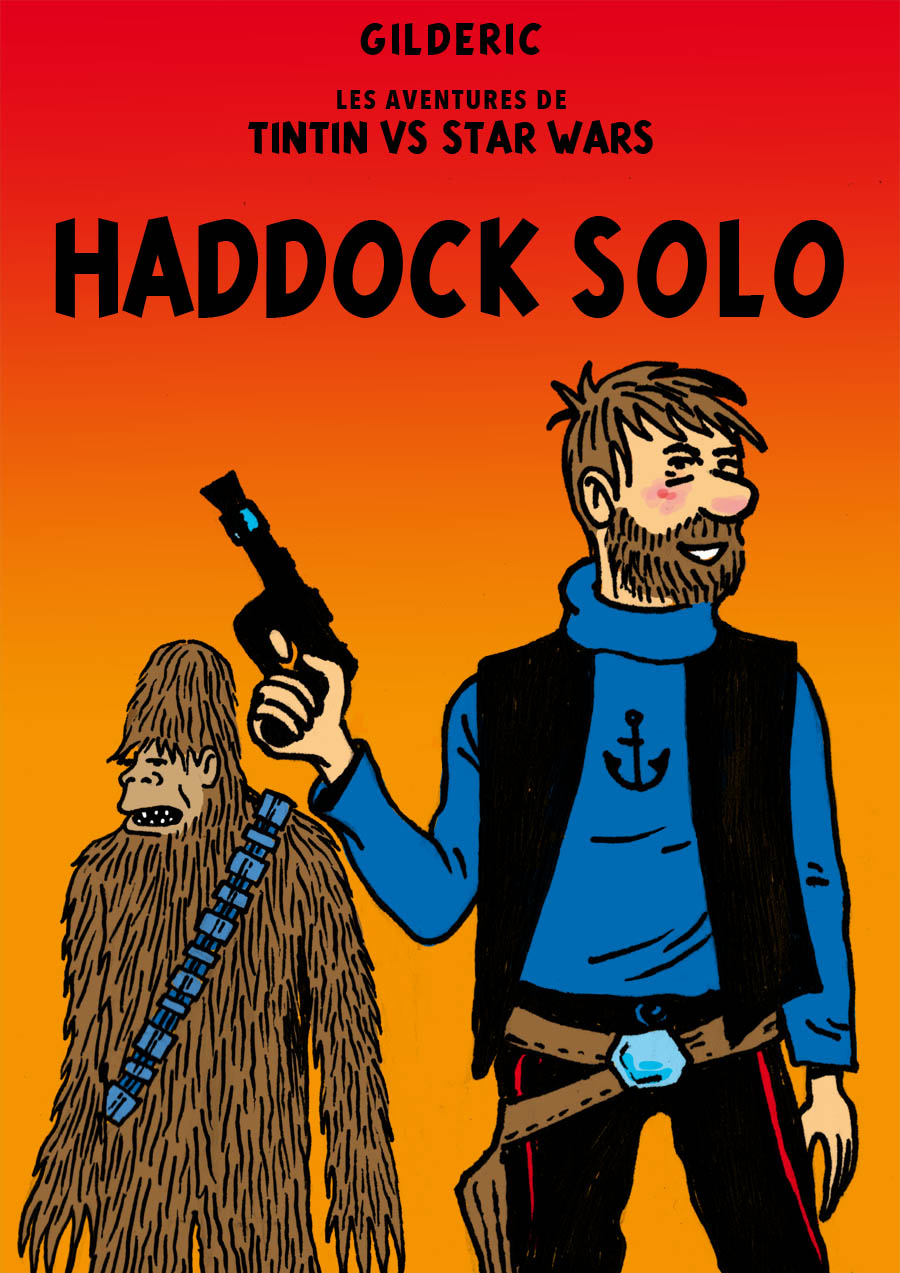 Tintin vs Star Wars : Haddock Solo et Chewbacca (couverture et affiche) Version alternative de l’affiche, à la façon d’une couverture d’un album de Tintin.