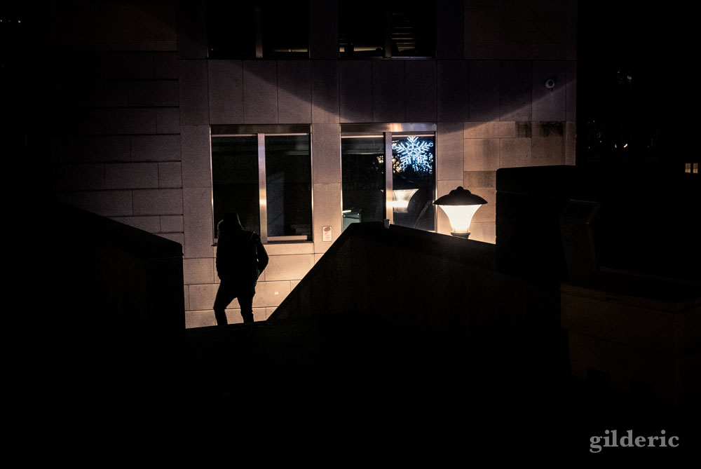 Les lumières, c’est chaud. Les décorations, c’est beau. Mais décembre réserve ses parts d’ombres, dans lesquelles le photographe peut s’engouffrer. Les petits matins, en particulier, sont des moments propices pour explorer cette face obscure de la ville illuminée. Une partie des citadins dorment encore ou ne sont pas encore partis. Le soleil n’est pas encore levé et les illuminations sont toujours (ou déjà) allumées.