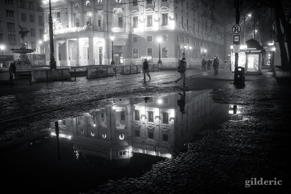 Profiter des flaques d’eau (quand il y en a), est une bonne idée pour réaliser des photos originales et spectaculaires. Cette astuce se vérifie en toutes saisons, mais les reflets des illuminations de Noël permettent de réaliser des photos particulièrement intéressantes.