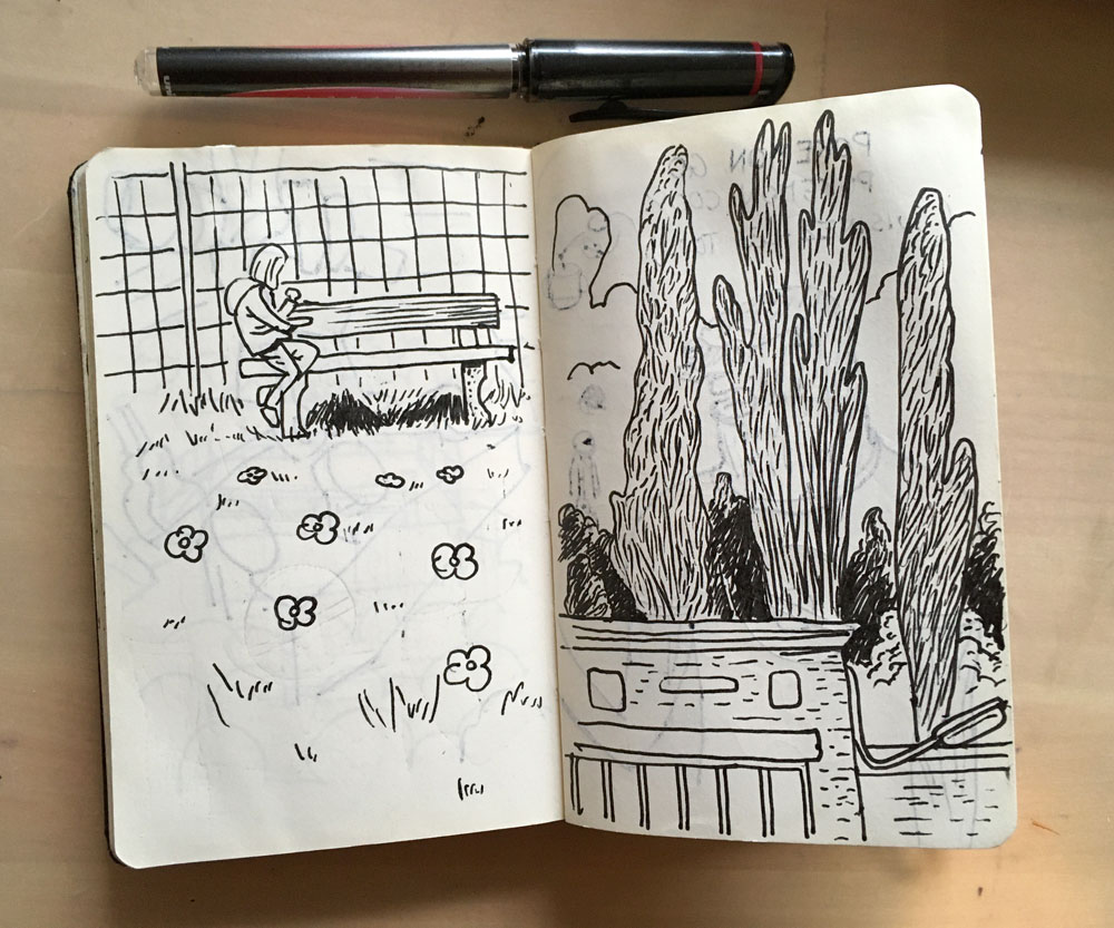 Dessins dans un petit carnet Moleskine, faits à la plaine de jeu